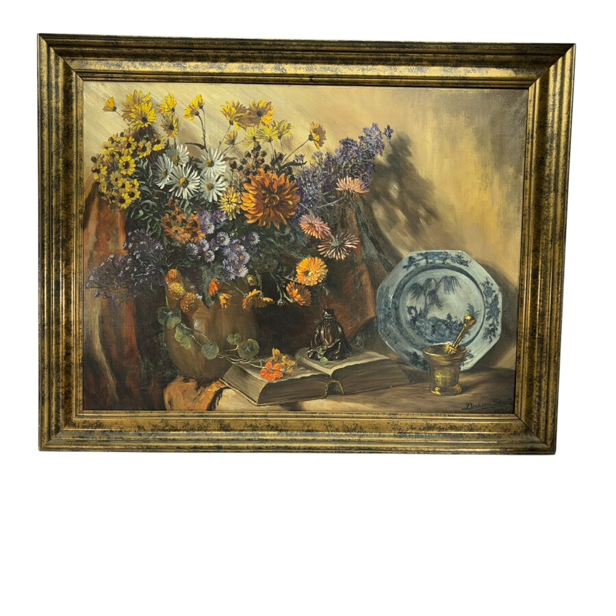 Schilderij, olieverf op doek. Bloemstilleven met 18e eeuws Chinees bord, boek, vijzel en bronzen beeld van een wijsgeer. Rechtsonder gesigneerd Jan Derksen Staats (Middelburg (Zuid-Afrika) 1897 ...