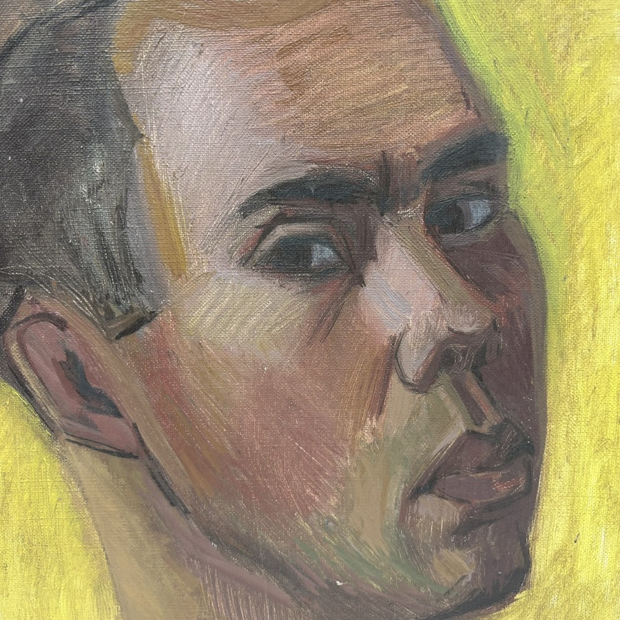 Schilderij olieverf op doek, . Portret van een Indische man. Gesigneerd en gedateerd: AV 12-7-1950. Kunstenaar onbekend.