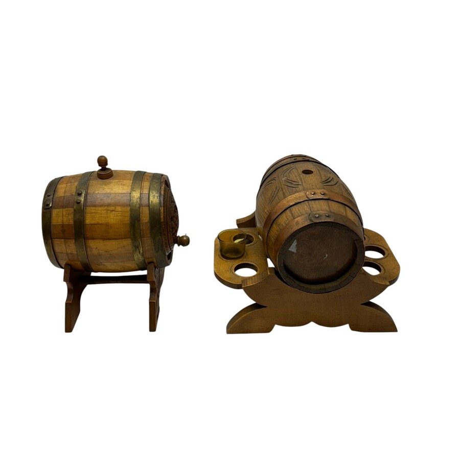 Twee gekuipte dranktonnetjes, waarvan één met gestoken vruchtendecor, en één met ruimte voor zes borrelglaasjes