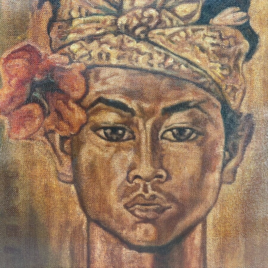 Schilderij, olieverf op doek. Portret van een traditionele Indonesische man.