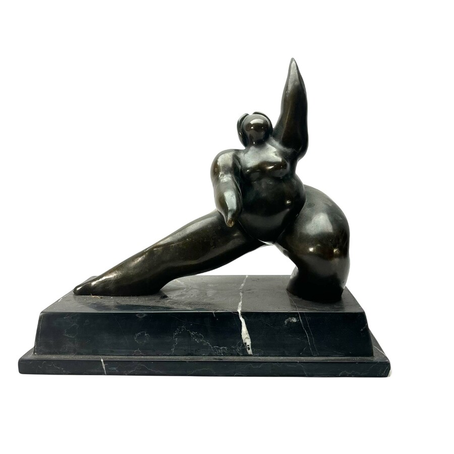 Een 20e eeuws bronzen beeld, gestileerde dame met gestrekt rechterbeen, op marmeren sokkel