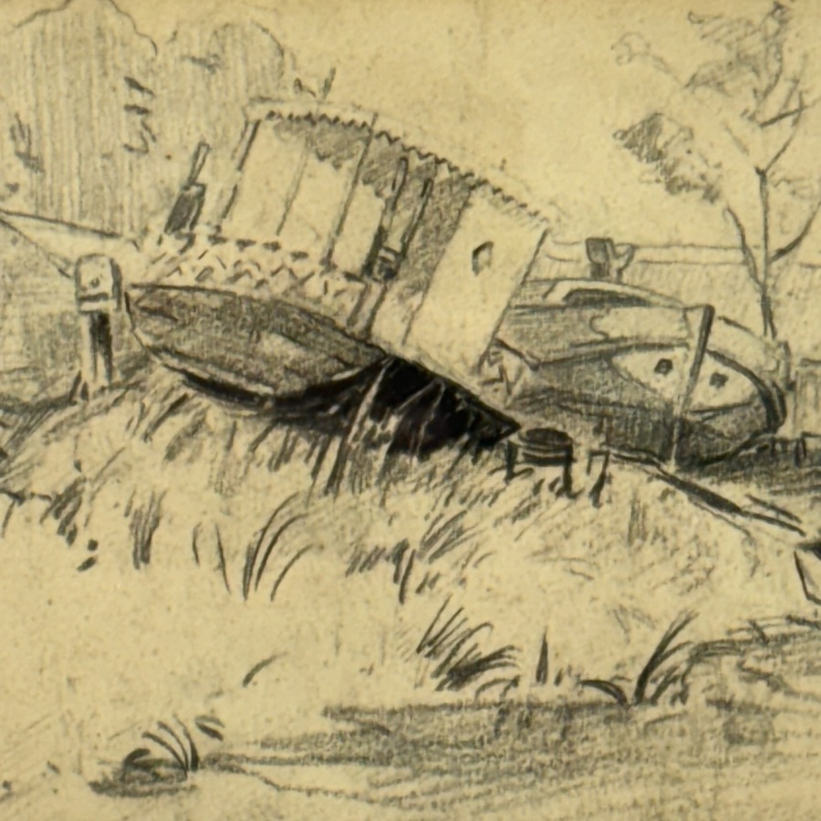 Potloodtekening op papier. Voormalig scheepswerfje aan Kleyenburg aan de oostkant van Leeuwarden, ca. 1925, met op de kade een afgedankt stadspontje. Linksonder gesigneerd Andries van der Sloot ...