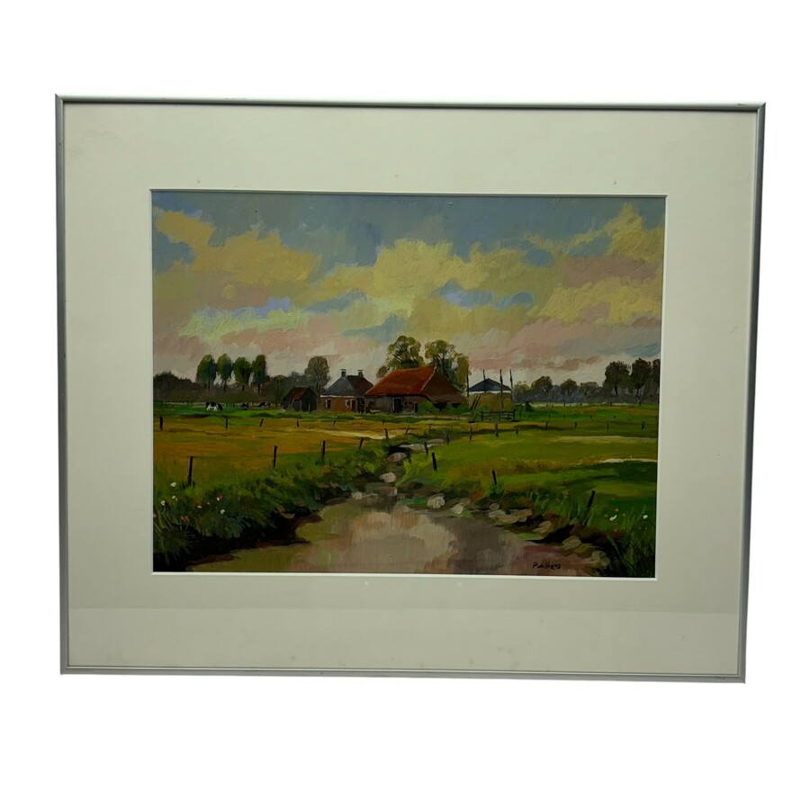 Schilderij, marouflé. Zomers landschap met vaart en boerderij. Rechtsonder gesigneerd Piet de Vries (Koudum 1932 - Drachten 2003).