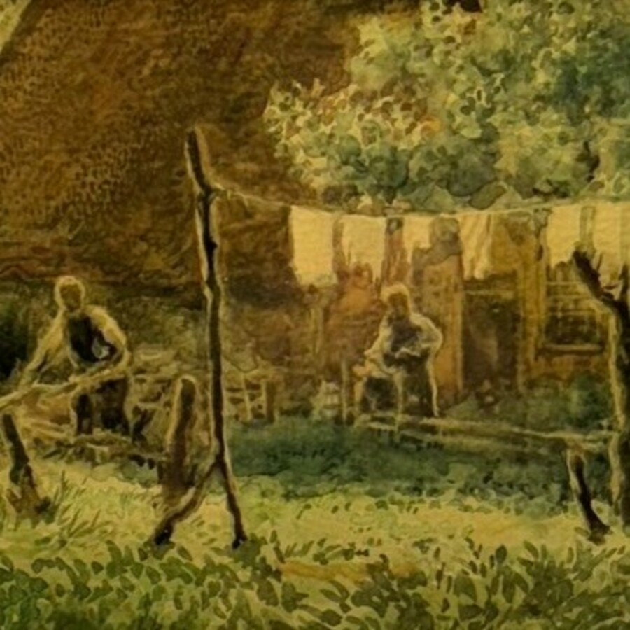 Aquarel op papier, boer en boerin bij boerderij, met op de voorgrond een waslijn. Rechtsonder gesigneerd 'R.', verdere signatuur vermoedelijk onder passe-partout. Mogelijk Leidse School, 20e eeu...