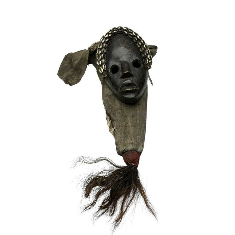 Een 20e eeuws Afrikaans houten en stoffen masker, bezet met schelpen. Aan de binnenzijde met label 'Dan masker, type Gunyege, Liberia en Ivoorkust'.