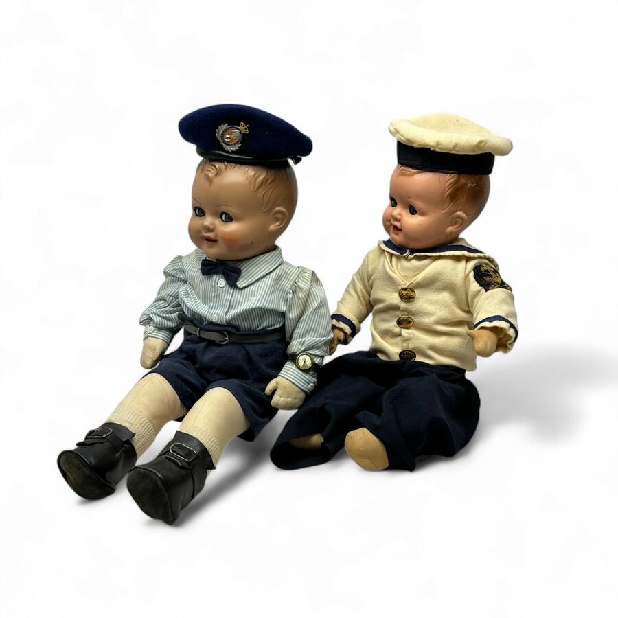 Twee antieke poppen van jongetjes: politieman en matroos, beide met stoffen lijfje en leden, en hoofdje van beschilderd composiet, niet gemerkt, uitvoering onbekend, tweede kwart 20e eeuw