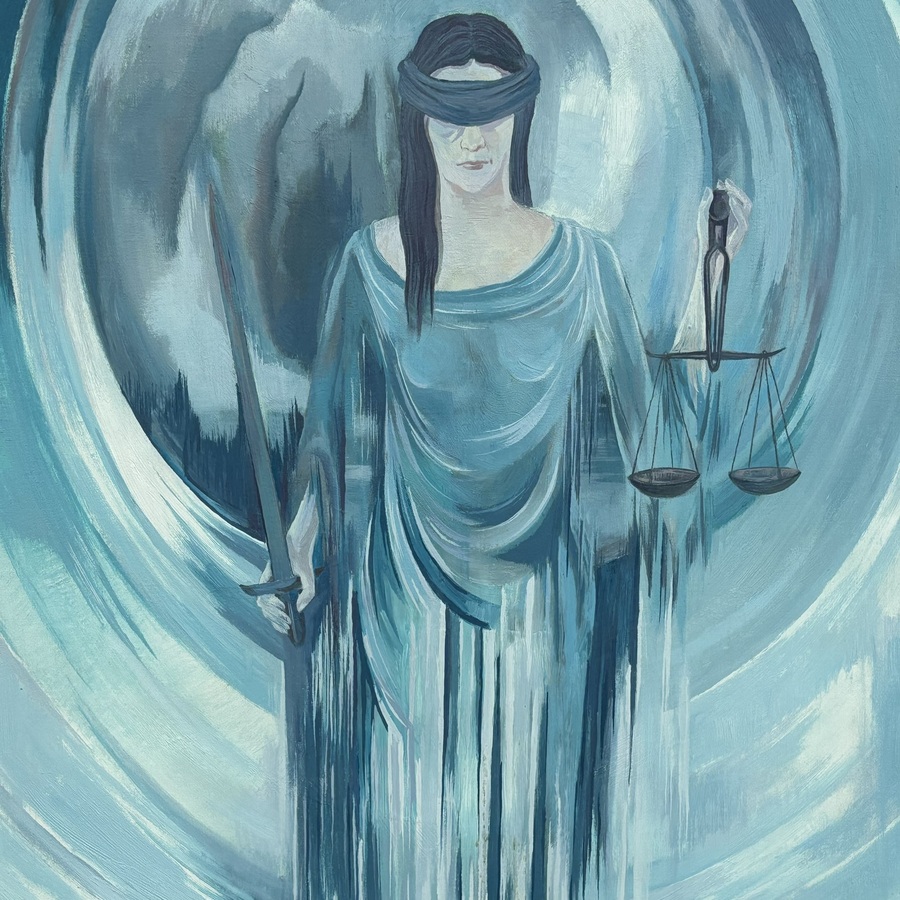 Schilderij, olieverf op doek. 'Vrouwe justitia', met Fries landschap op de achtergrond. Rechtsonder gesigneerd Jan Murk de Vries (Bolsward 1919 - Harlingen 2015), gedateerd 1982.