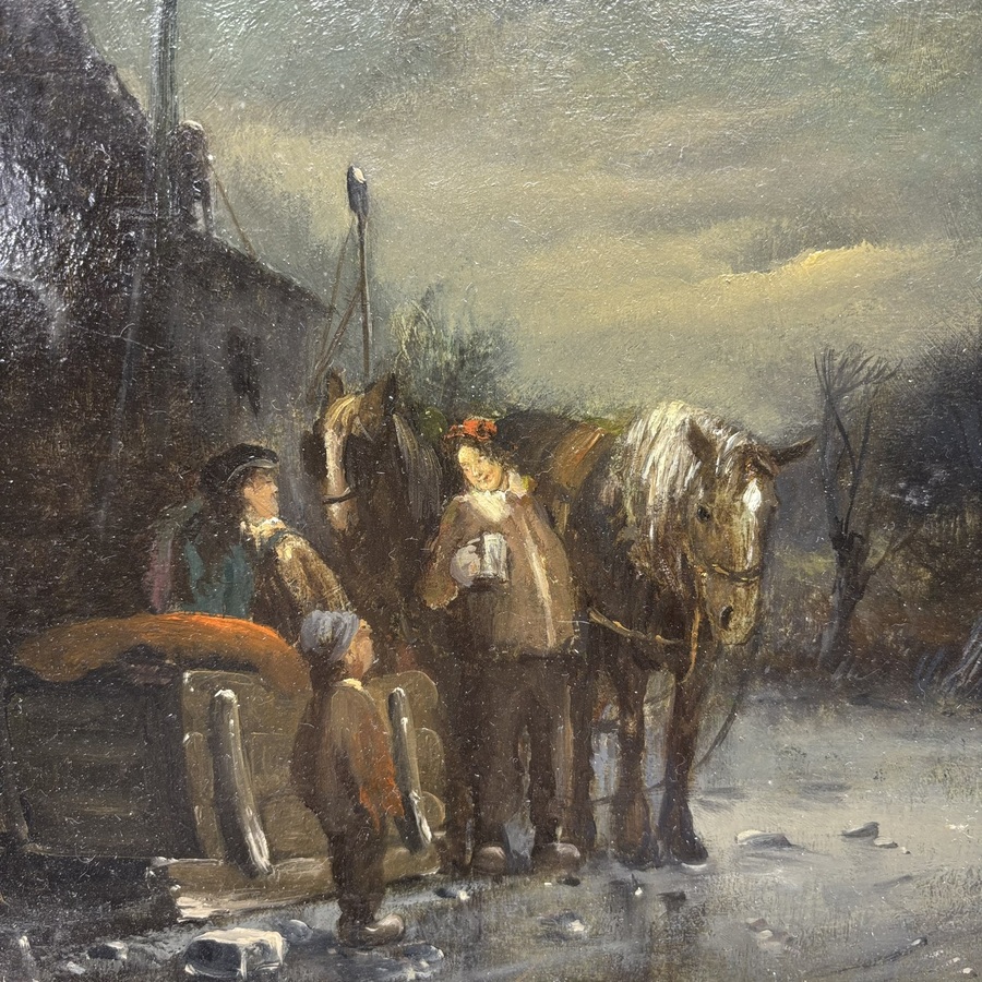 Schilderij, olieverf op paneel. IJsgezicht met figuren, paarden en een slee. Rechtsonder gesigneerd 'van Prooijen', Hollandse School 19e eeuw.