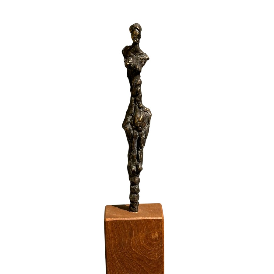 Een 20e eeuws bronzen sculptuur, vrouwenlichaam, gemonteerd op grote vierkant houten sokkel. Gesigneerd 'Jissy' = Jissy Keuenhof (Kampen, 1970), gedateerd 2003.