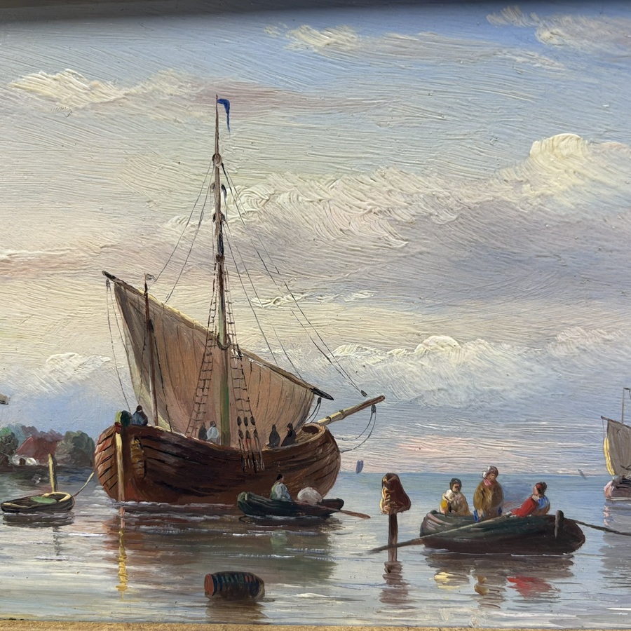 Schilderij, olieverf op paneel. Hollands zeegezicht met schepen, roeiboten en een molen op de achtergrond. Draagt rechtsonder valselijke signatuur A.J. van Prooijen en linksonder signeerd G. (of...