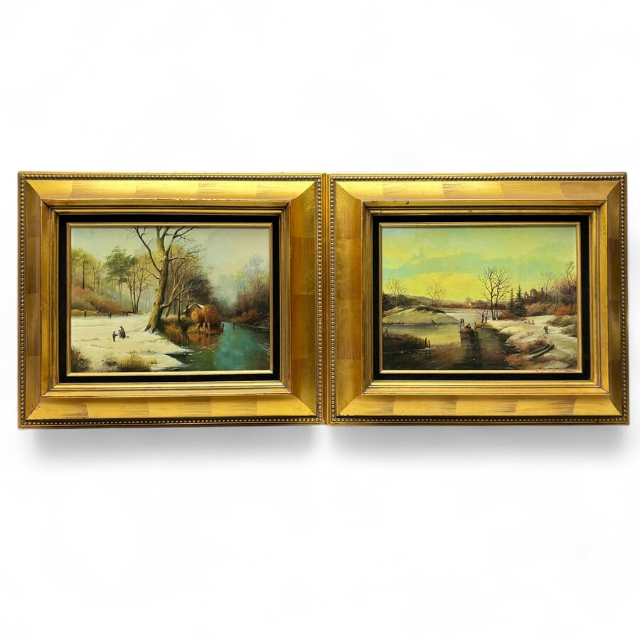 Twee schilderijen, olieverf op paneel. Winterlandschappen. Beide rechtsonder gesigneerd Shirley Anne Webb. In vergulde profiellijsten.