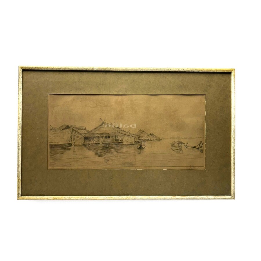 Een 20e eeuwse ets, Indonesië, titel ‘Vlotwoningen’. Rechtsonder onduidelijk gesigneerd (Ch.N’