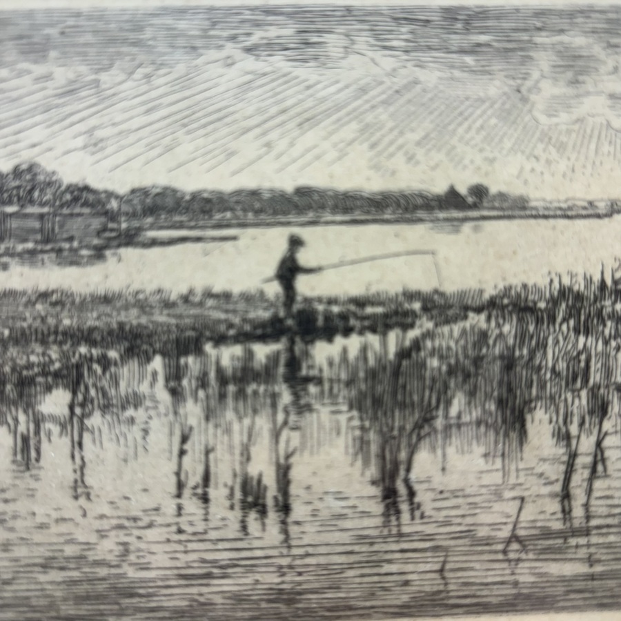 Ets op papier, voorstelling van een visser aan de waterkant, titel ‘aan de Grote Wielen (bijdruk in 1907)’. Rechtsonder gesigneerd Ids Wiersma (Brantgum 1878 – Dokkum 1965)