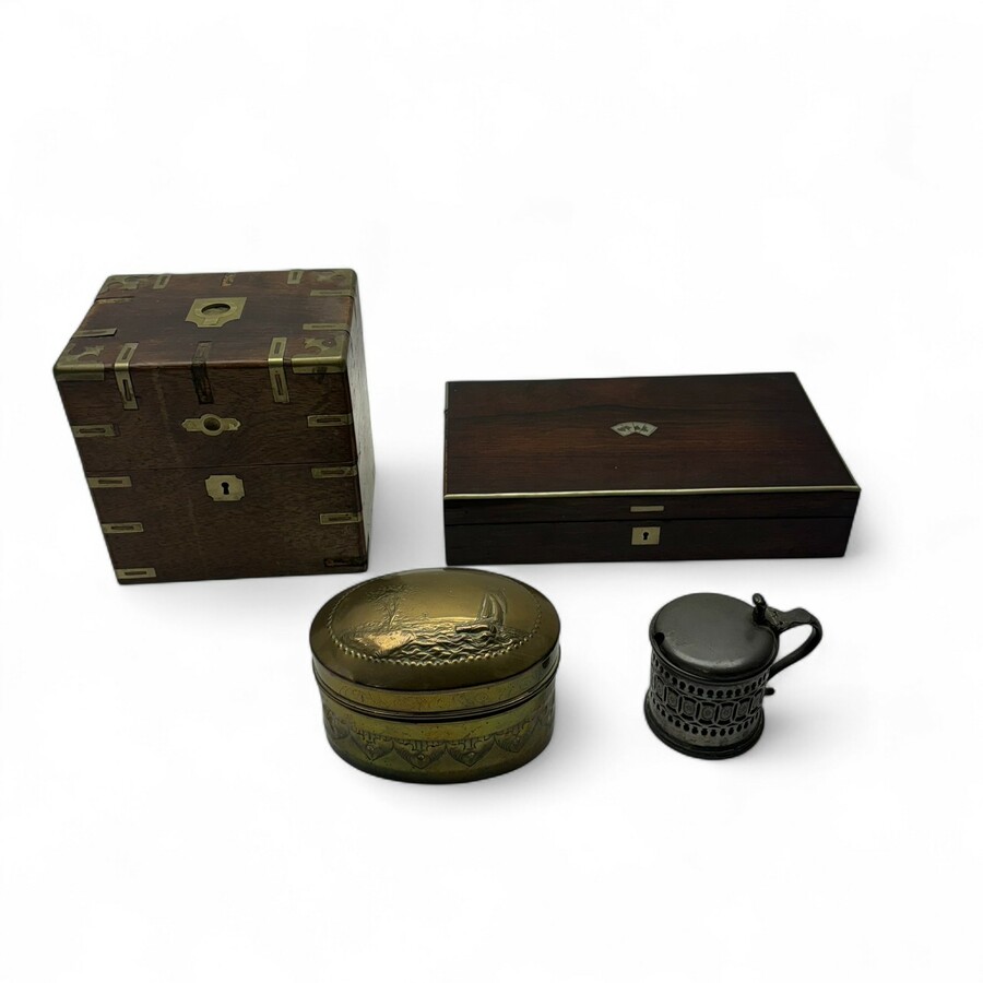 Lot diversen: tinnen mosterdpotje, koperen theebus Klaas Dijkstra, 19e eeuws houten en messing kistje en 19e eeuws speeldoosje met benen fiches