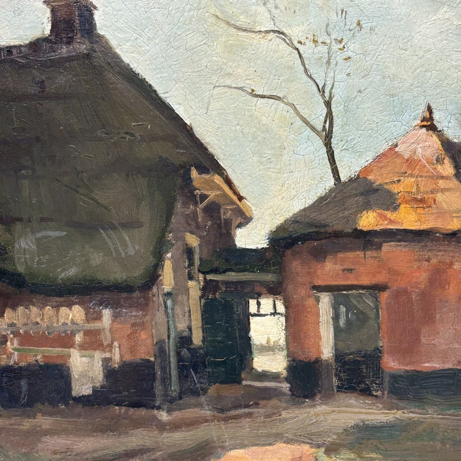 Schilderij, olieverf op paneel. Boerenhoeve met klompenrek. Linksonder gesigneerd J.C. Roelandse (Leiden 1888 - Leiderdorp 1978).