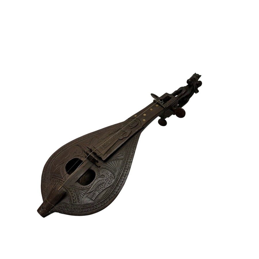 Een 20e eeuws houten snaarinstrument, lyra, gestoken, aan de bovenzijde bekroond met man op paard.