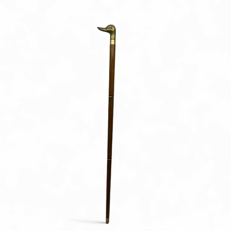 Wandelstok met messing greep in de vorm van een eend, met bovenin een verborgen glazen flacon, in vier delen los/in elkaar te schroeven, 20e eeuw