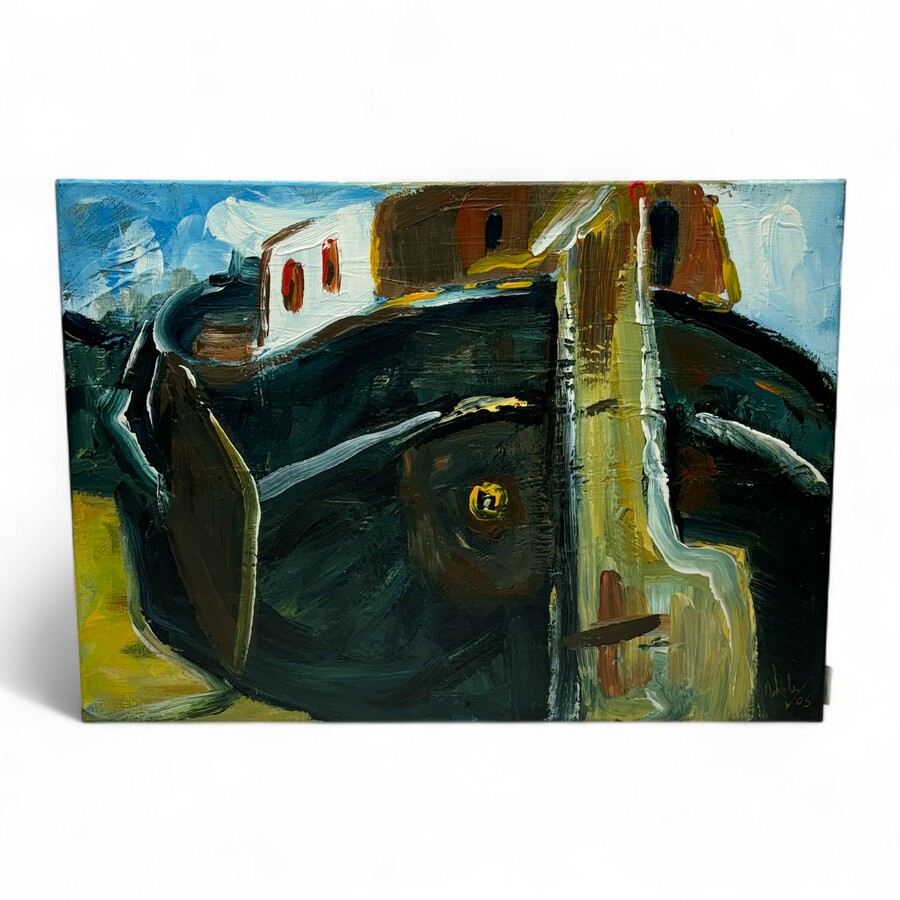 Schilderij, acryl op doek. Voorstelling van een schip, rechtsonder gesigneerd Wigle Engelsma (Koudum, 1953), gedateerd 2005.
