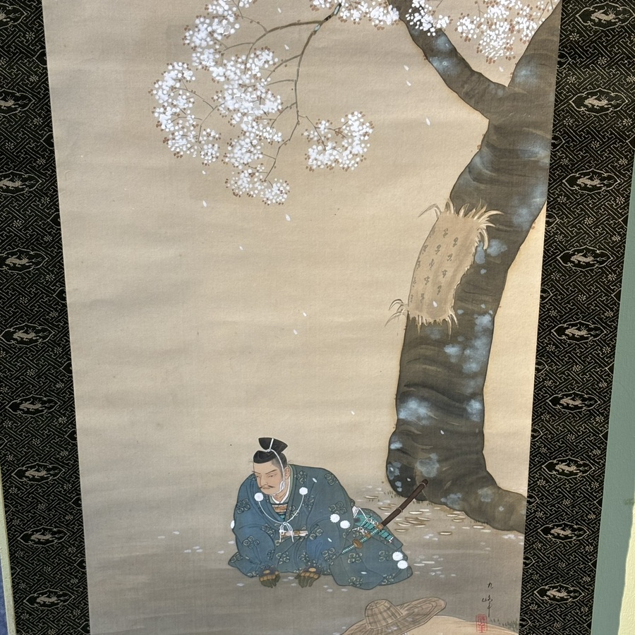 Japanse scroll met voorstelling van de militair leider Kojima Takanori, knielend onder een bloesemboom, waarop een gedicht zit gespijkerd, waarmee hij volgens de legende zijn loyaliteit aan keiz...