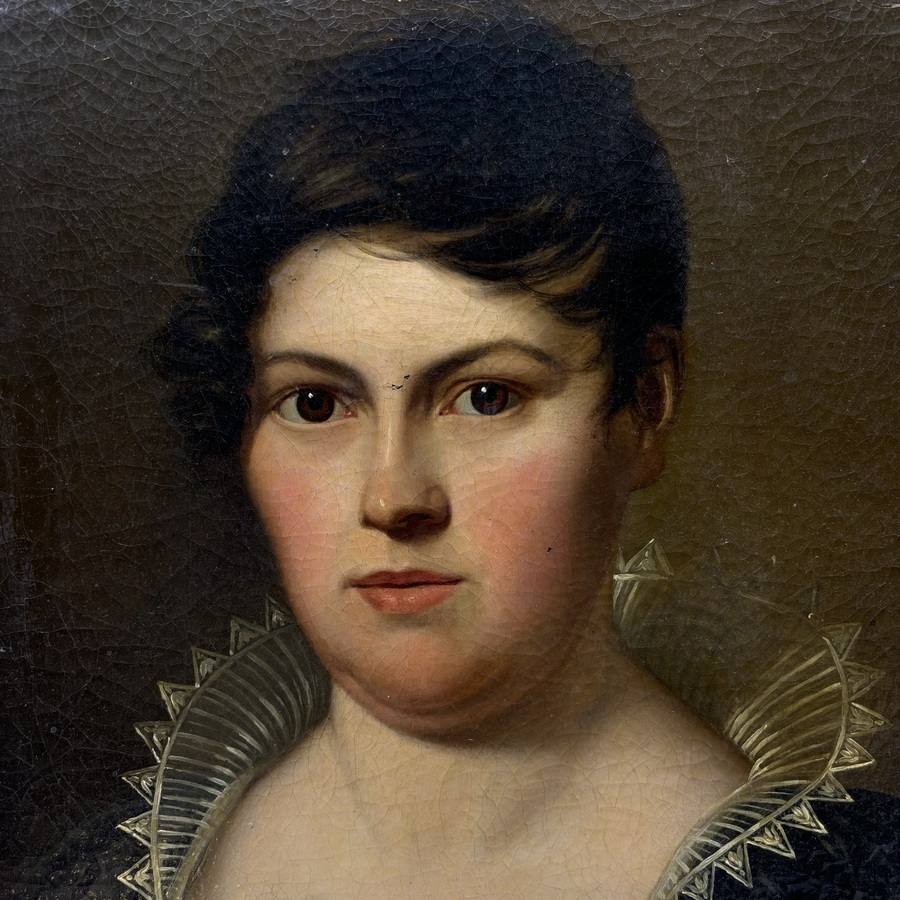 Schilderij, olieverf op doek. Portret van een dame met kanten kraag. Ongesigneerd, Hollandse School ca. 1800.