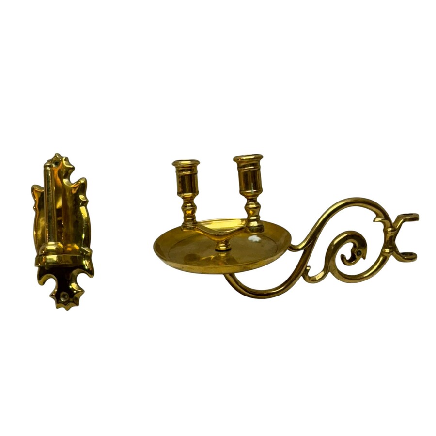 Messing tweelichts wandkandelaar met krulvormige sierarm, en geschulpte achterplaat, 20e eeuw