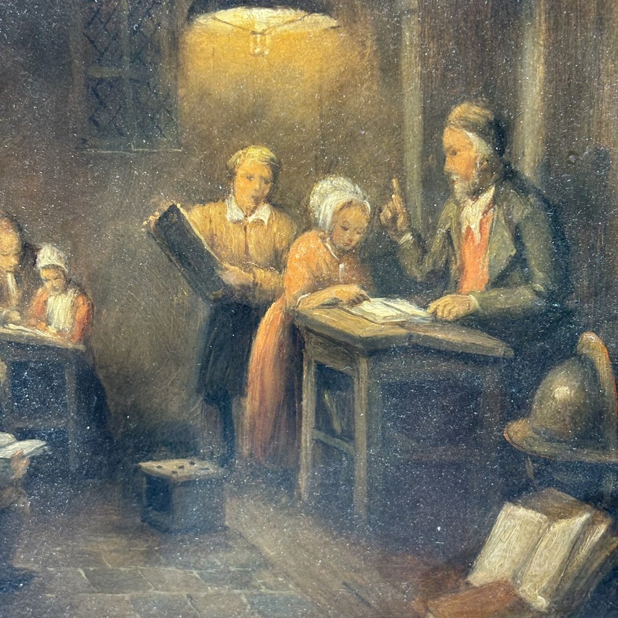 Schilderij, olieverf op paneel. Voorstelling van een schoolklas met kinderen en meester. Ongesigneerd, ca. 1850.