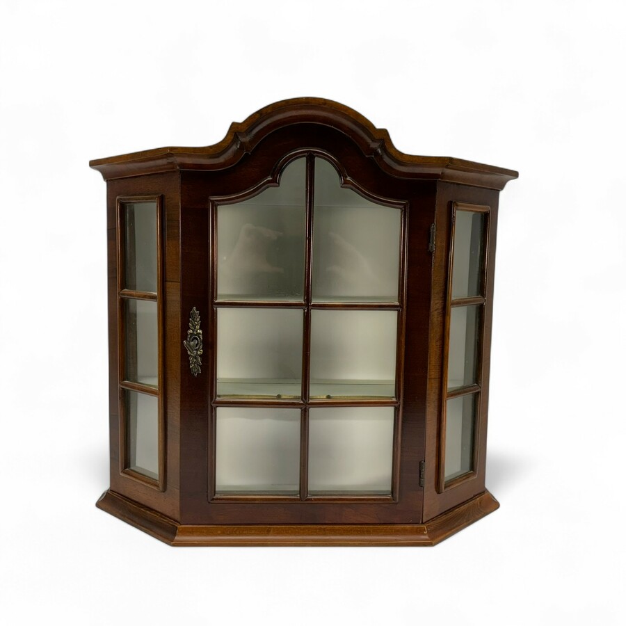 Een 20e eeuws mahoniehouten gefineerd hangvitrinekastje met drie leggers
