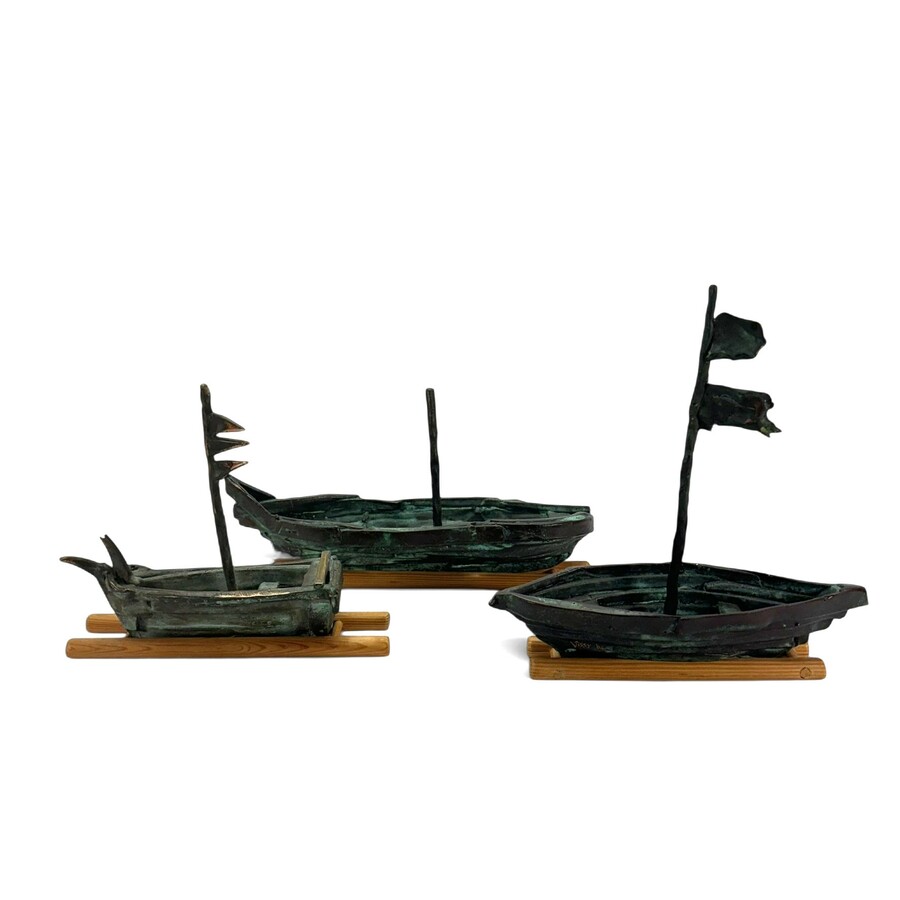 Lot van drie bronzen sculpturen, voorstelling van schepen, op houten sokkels. Allen gesigneerd 'Jissy' = Jissy Keuenhof (Kampen, 1970), gedateerd 2004.