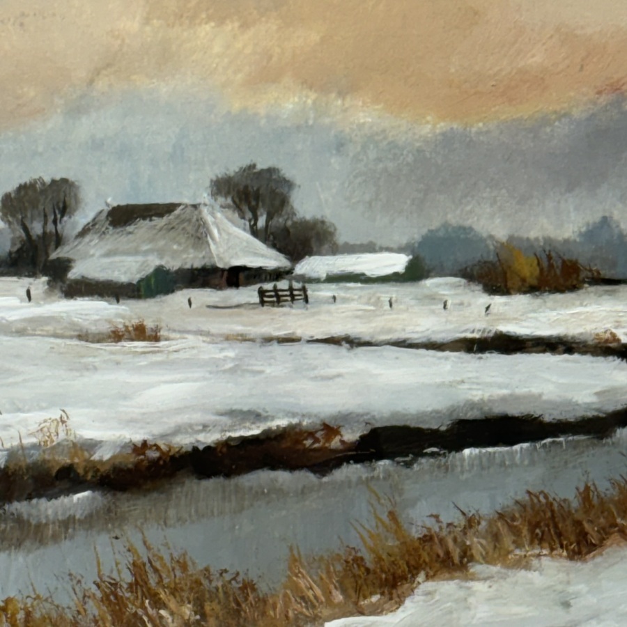 Schilderij, marouflé. Wintergezicht met vaart en boerderij. Rechtsonder gesigneerd Piet de Vries (Koudum 1932 - Drachten 2003).