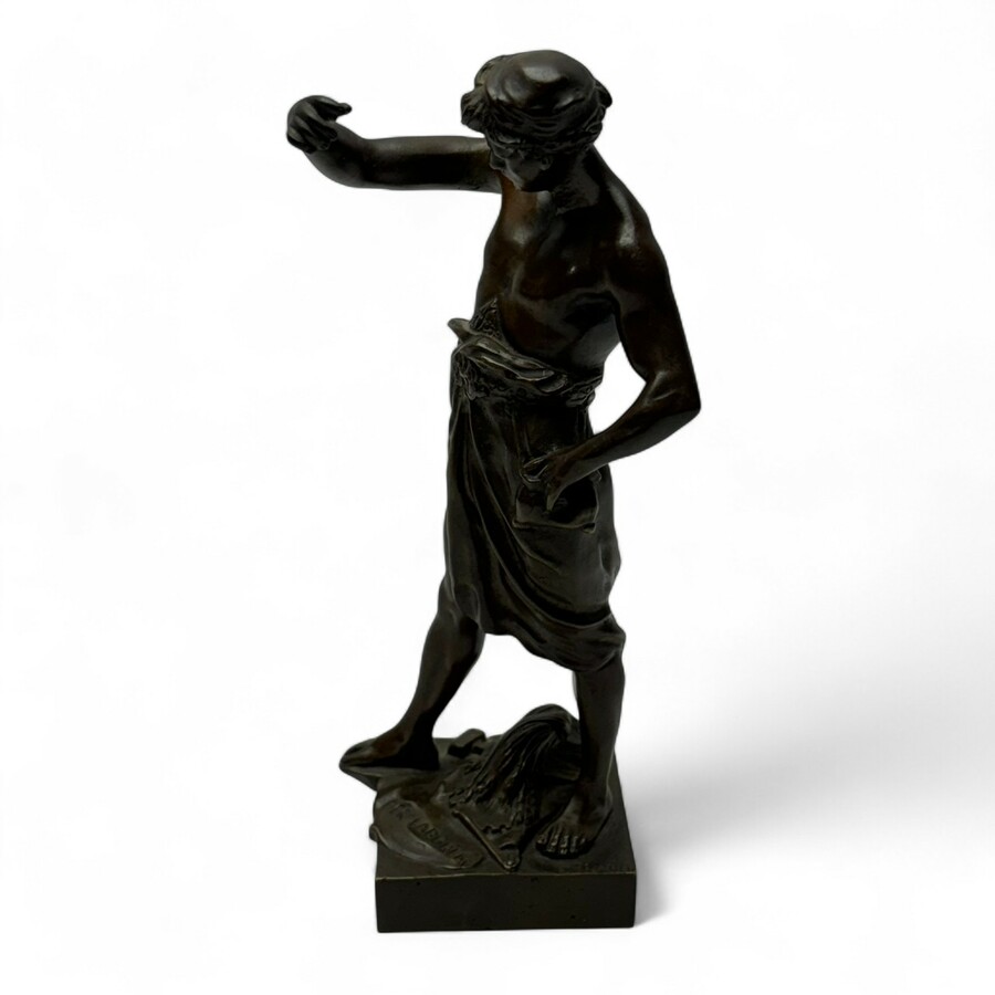 Antiek 19e eeuws bronzen sculptuur, voorstelling van een arbeider. Op de voet tekst 'Per Laborem', gesigneerd Emile-Louis Picault (1833-1915)