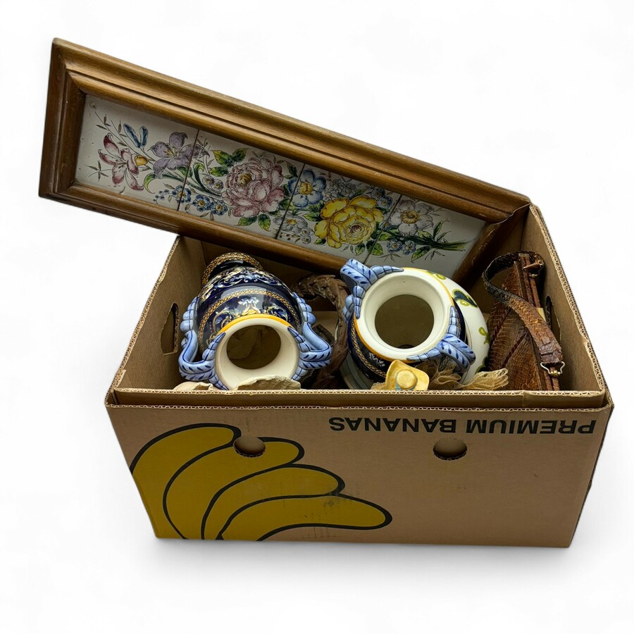 Lot diversen, waaronder polychrome tegels, damestasjes, twee vazen, gemerkt Gien France, en een platelen hangbloempot+