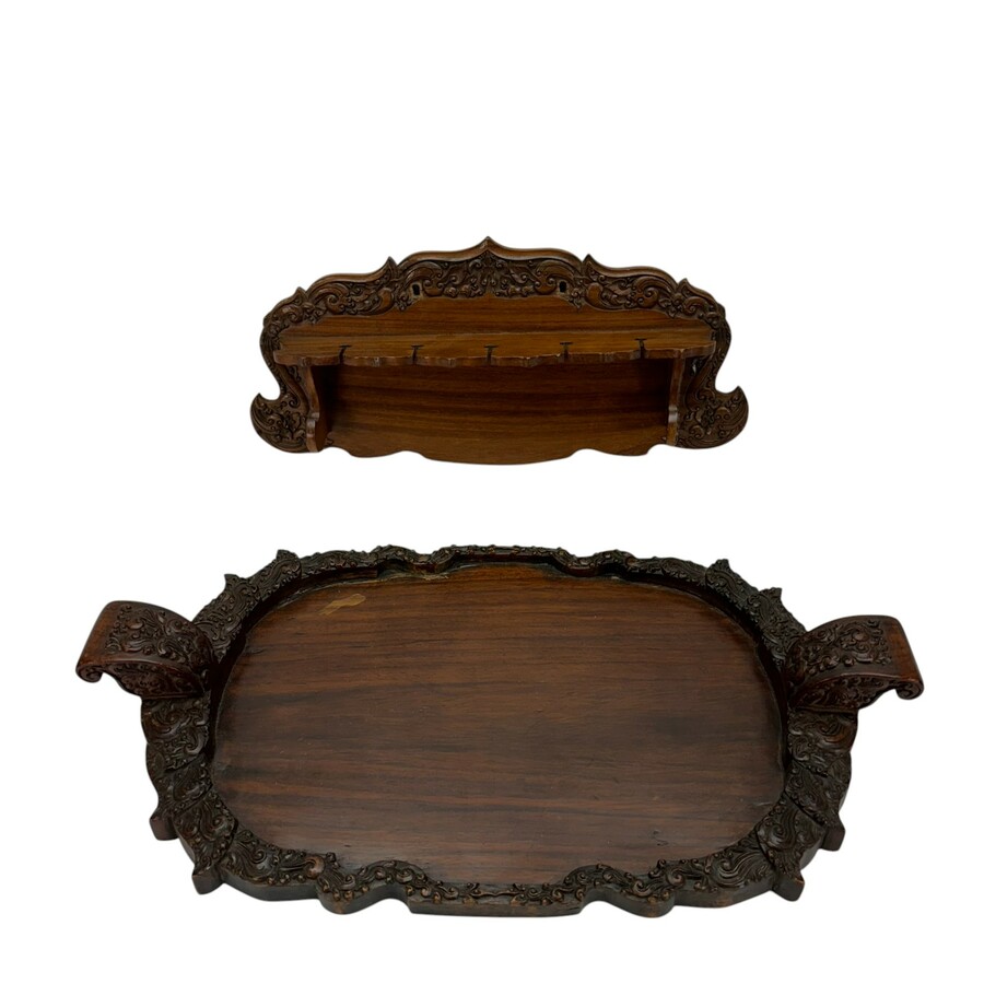 Een 20e eeuws floraal gestoken houten dienblad en lepelrek. Bali, Indonesië , midden 20e eeuw.