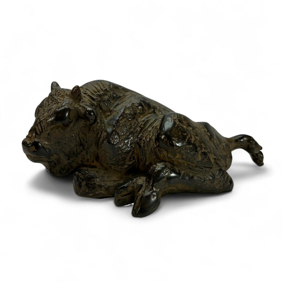 Een modern bronzen sculptuur, voorstelling van een liggende wisent. Aan de achterzijde gemonogrammeerd Hetty Heyster (Nijmegen, 1943).