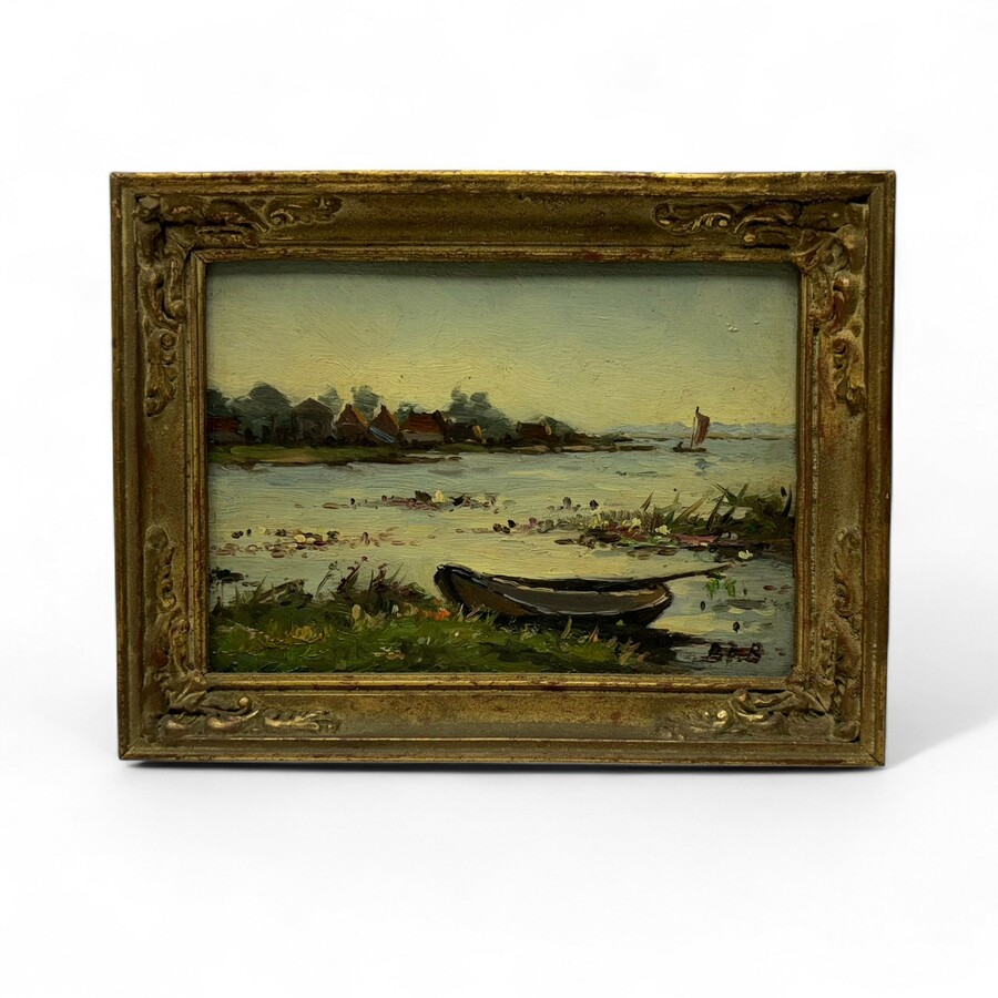 Schilderij olieverf op paneel. Fries landschap met bootje aan de waterkant. Gesigneerd RO B de B ( = Broer de Boer 1877-1953). Gelijst.