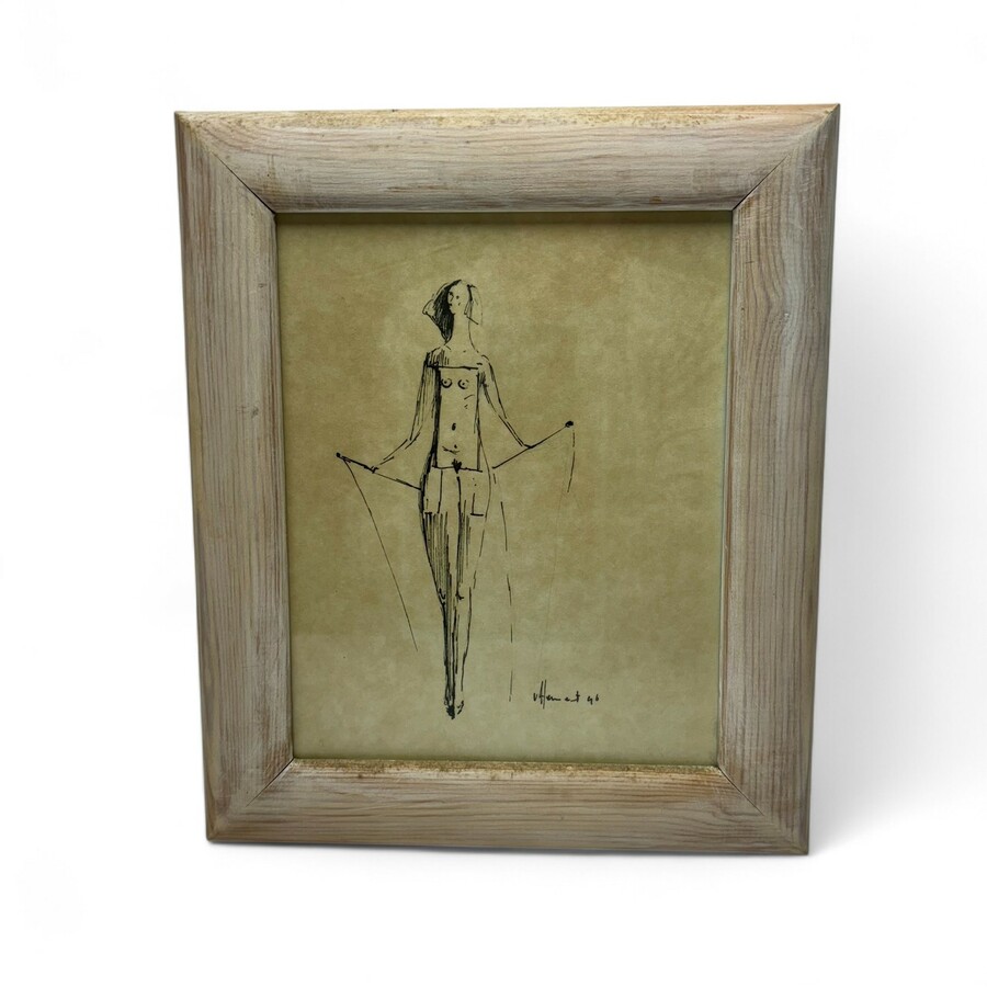 Een inkttekening op papier. Een naakte dame. Gesigneerd V Hermert = Evert van Hemert, serie nr 46. Gelijst.