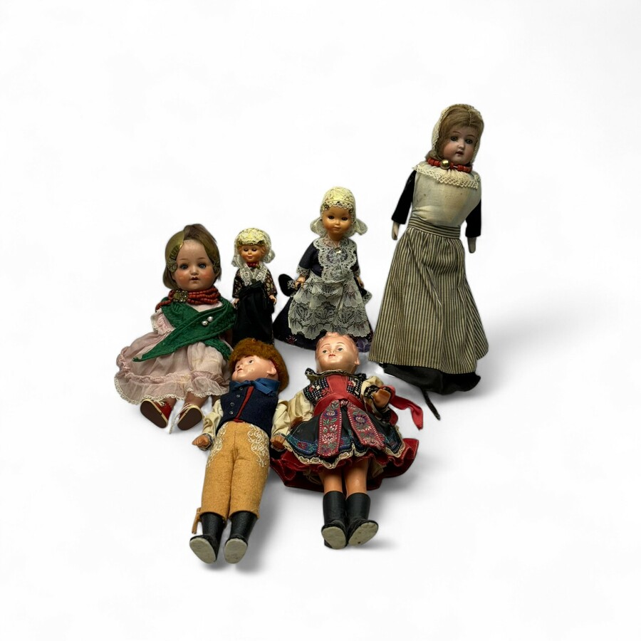 Zes antieke popjes in klederdracht, alle begin/midden 20e eeuw, waaronder: paar kunststof popjes in Tsjechische klederdracht, tweede kwart 20e eeuw, en popje met oorijzers, het hoofdje en de led...