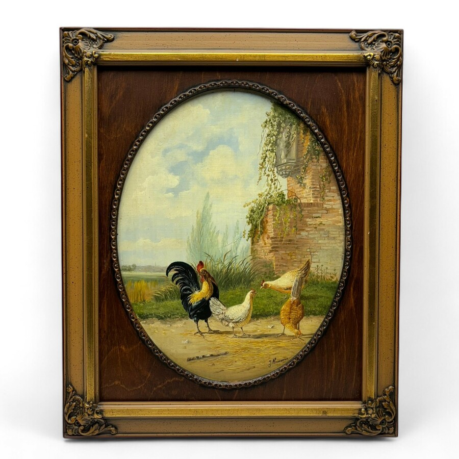 Schilderij, olieverf op paneel. Drie kippen en een haan, in de stijl van Verhoesen. Rechtsonder gesigneerd J. Heeneman