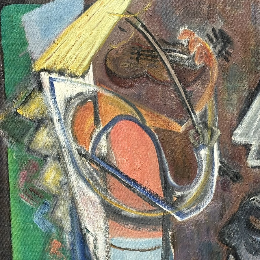 Schilderij, olieverf op doek. Compositie met violist en kat in kubistische stijl. Gesigneerd Richard Baumgart (New York City, Verenigde Staten, 1946), gedateerd 1987.