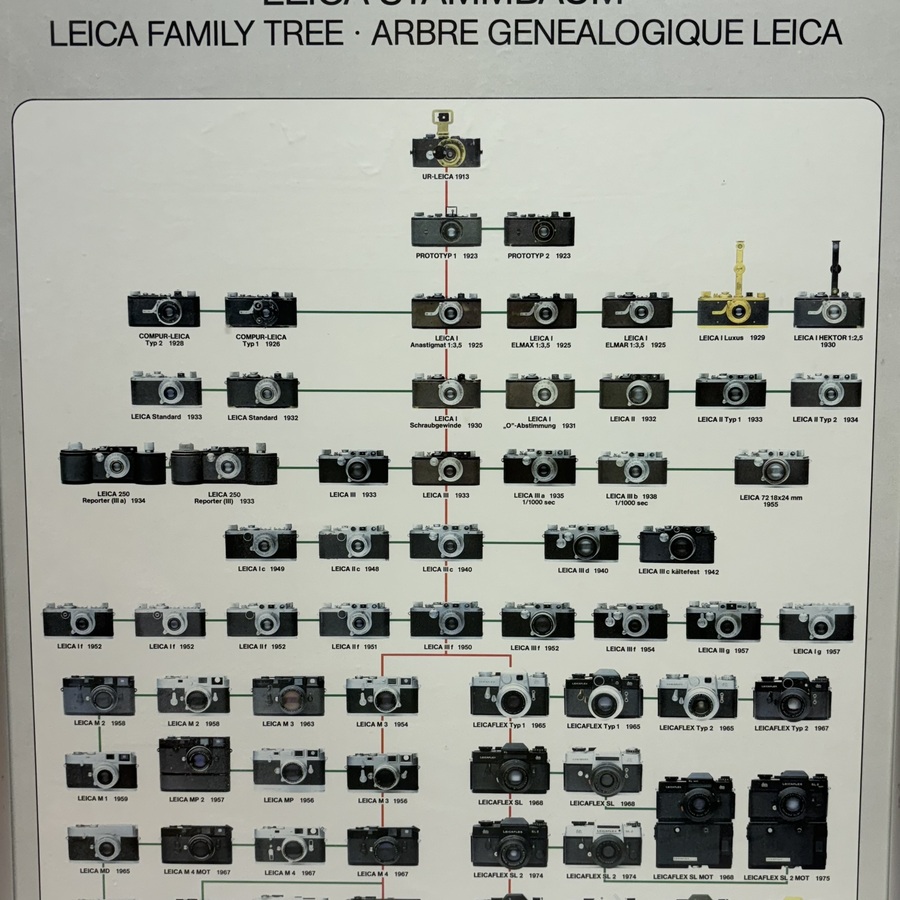 Een jaren '80 affiche, 'Leica-Stammbaum', met alle verschillede modellen van Leica tussen 1913 en 1980.