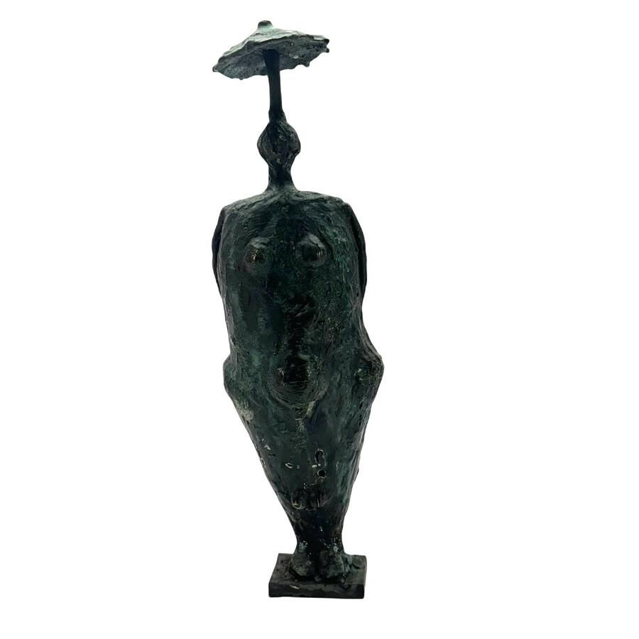 Een 20e eeuws bronzen sculptuur, voorstelling van een staande vrouw met hoed of parasol. Ongesigneerd.