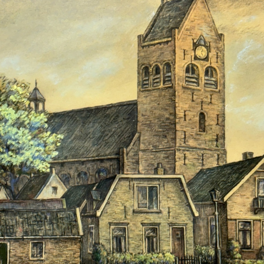 Gemengde techniek op papier, gezicht op Grou vanaf de waterkant. Rechtsonder gesigneerd W.A. van der Zee, Hollandse School 20e eeuw.