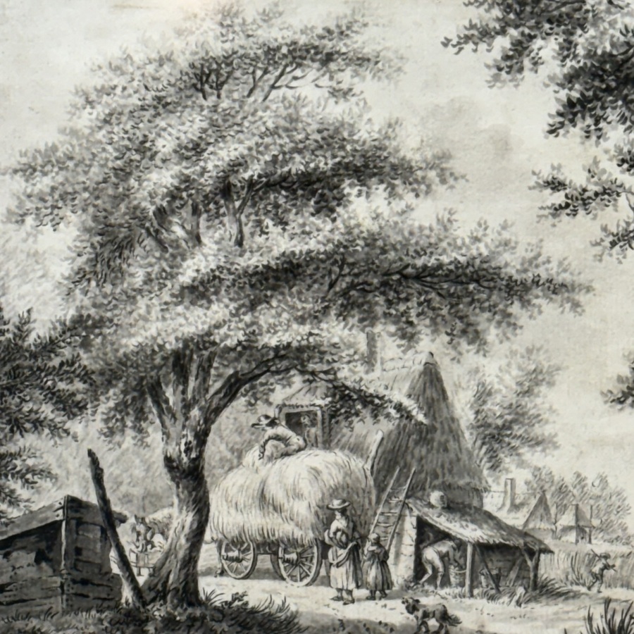 Tekening, gewassen inkt op papier. Voorstelling van een boerderij met hooiwagen. Ongesigneerd, Hollandse School 19e eeuw.