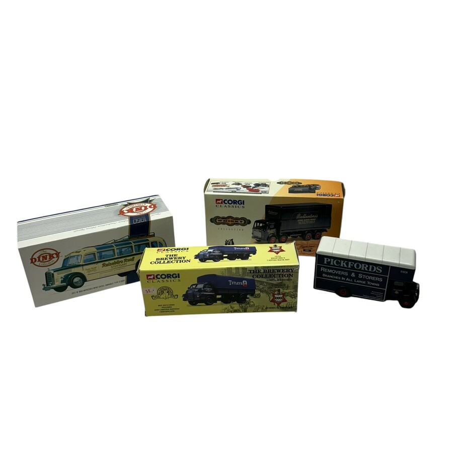 Lot modelauto's: Corgi 2x in doos (Ballantines Albion Lorry en Tetley's Bedford S Canvas Back set en een losse Corgy, Bedford vrachtwagen. Met daarbij een Dinky Toys, DY-S 1950 Mercedes-Benz Die...