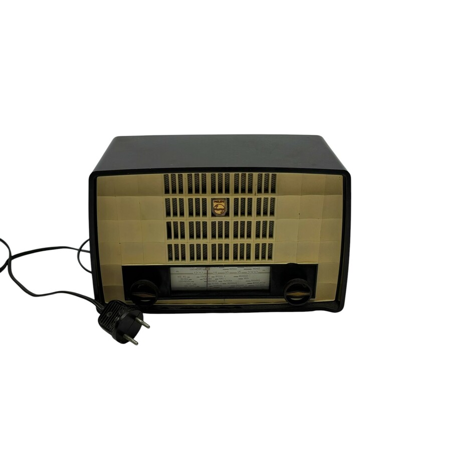Een jaren '50 wit en bruin bakelieten radio, Philips. Type BX156U, geproduceerd in 1955 en 1956.