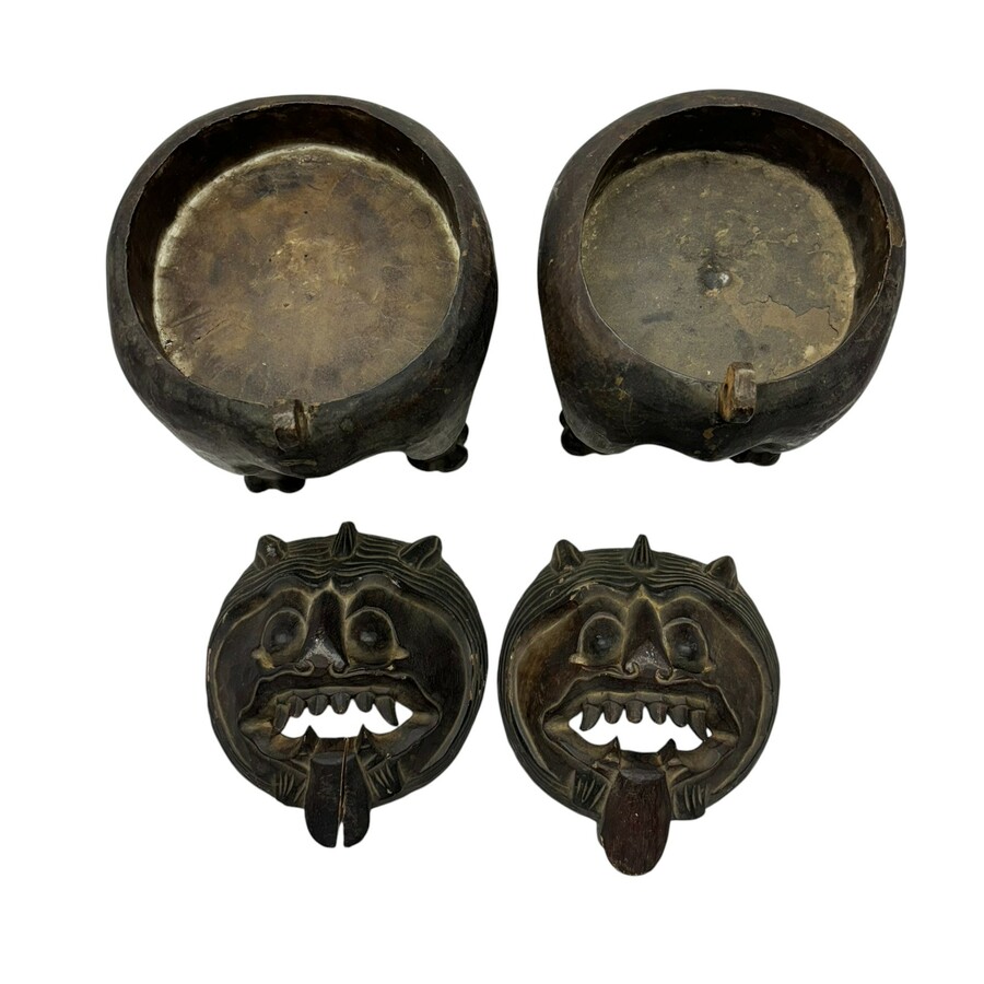 Lot van twee houten dekseldozen in de vorm van leeuwen, met losse deksels. Mogelijk wierookbranders.