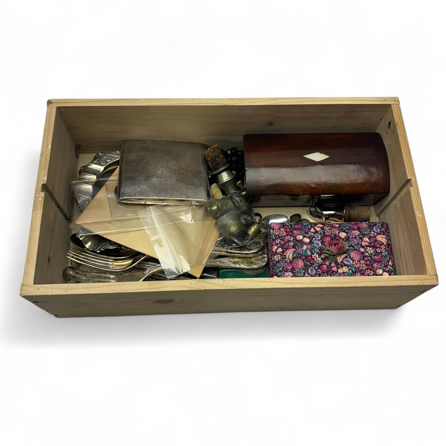 Een houten kistje gevuld met curiosa, waaronder verzilverd bestek en sigarettendoos