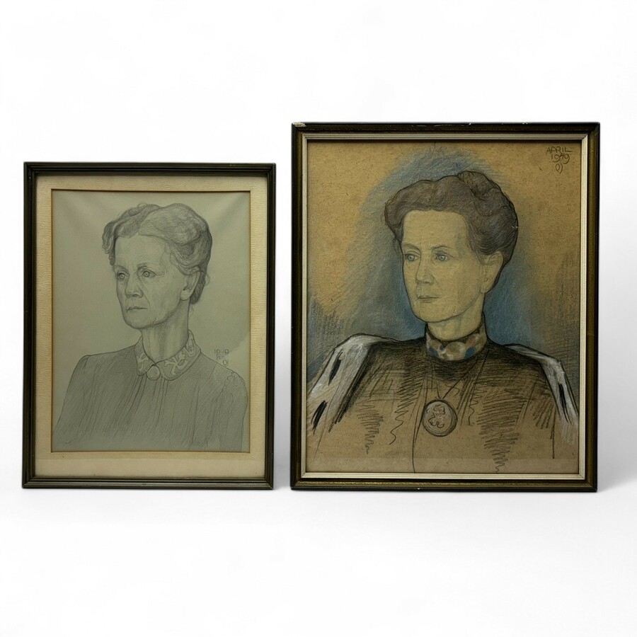 Twee poltoodtekeningen, waarvan 1 in kleur. Portretten van Mevr. Wensinck- Doubaton. Gesigneerd met een monogram voor Paul van Vliet Sr (1899-1990). Beide gelijst.