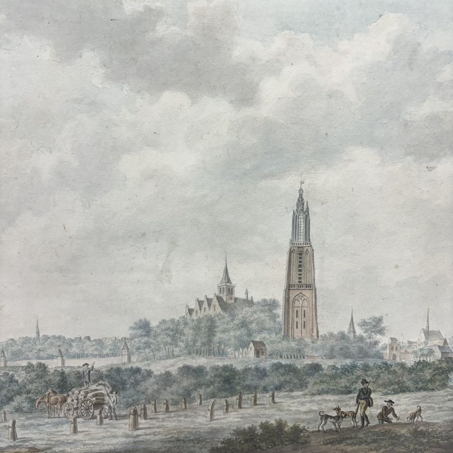 Aquarel op papier, stadsgezicht Amersfoort met de Onze Lieve Vrouwentoren. Rechtsonder gesigneerd Adrianus Gerardus van Schoone (Amsterdam 1785-1843), gedateerd 1817.