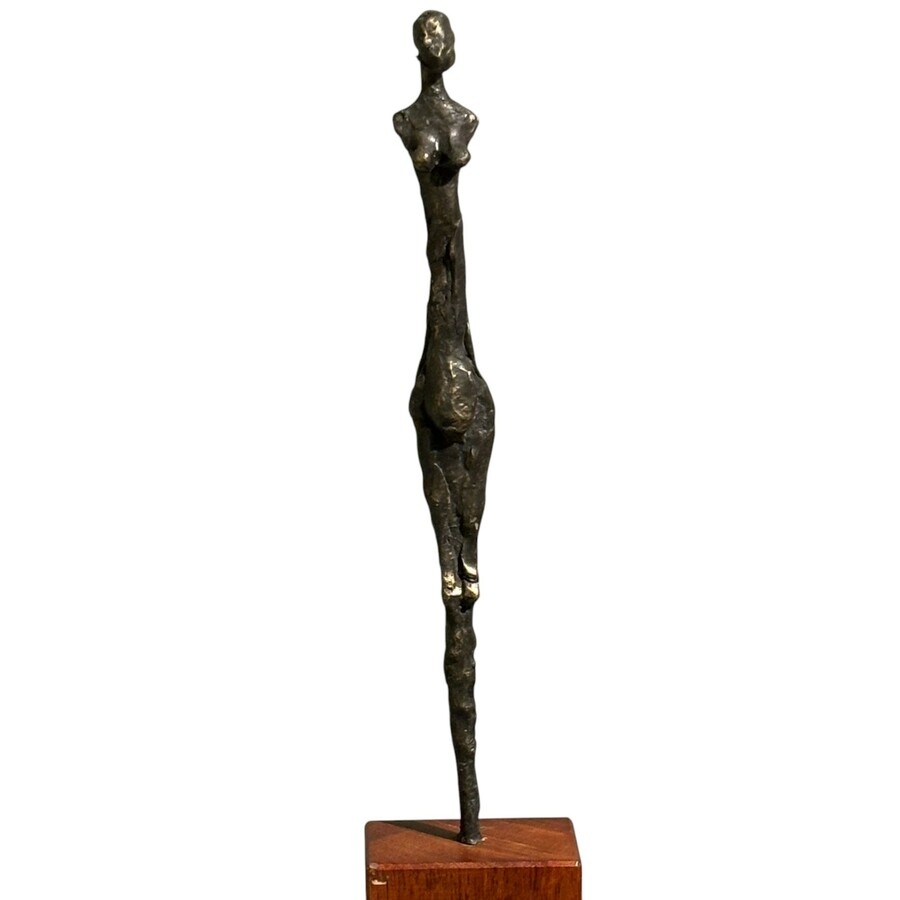 Een 20e eeuws bronzen sculptuur, vrouwenlichaam, gemonteerd op grote vierkant houten sokkel. Gesigneerd 'Jissy' = Jissy Keuenhof (Kampen, 1970), gedateerd 2003.