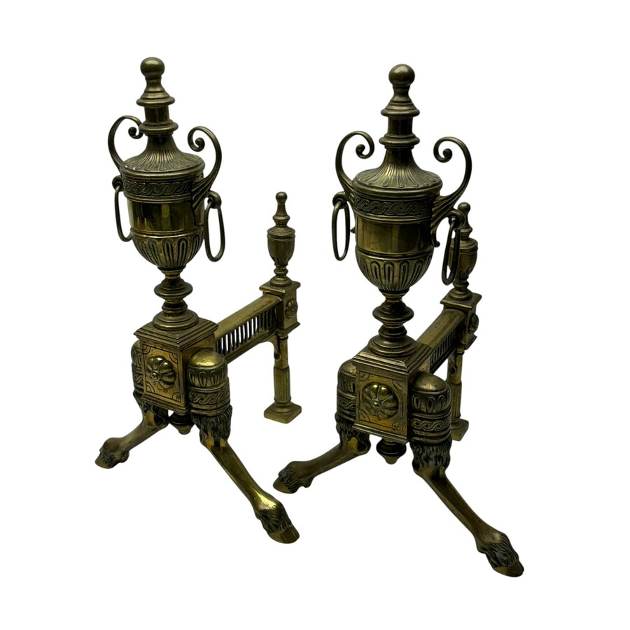Paar messing haardbokken met vaasvormige ornamenten, galerijrand, en 'bokkepootjes', eind 19e eeuw